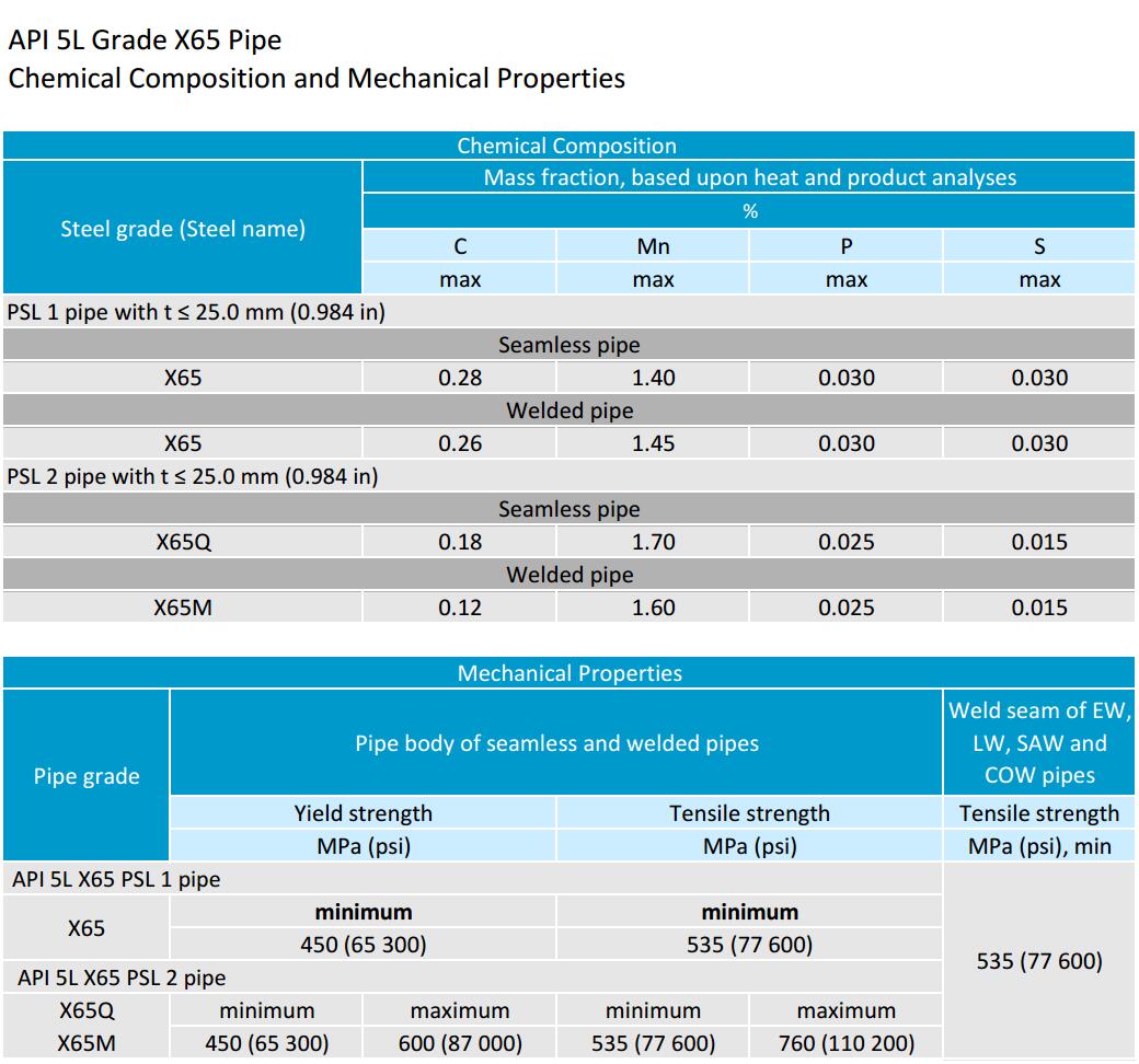 For API 5L X65 PSL2 (API 5L X65Q.M or L450Q/M), C ≤ 0.18, Si ≤ 0.18, Mn ≤ 1.70, P ≤ 0.025, S ≤ 0.015, all of these elements have less value than PSL1. Since PSL2 requires CEq ≤ 0.43, and CEpcm ≤ 0.25. (Ceq is carbon equivalent, it affects the steel welding performances, strength value). And because of this, API 5L X65 PSL2 pipe (welded and seamless) mechanical strength has a maximum limits: yield strength 450 – 600 Mpa (65300 psi to 87000 psi), tensile strength 535 to 760 Mpa (77600 psi to 110200 psi)