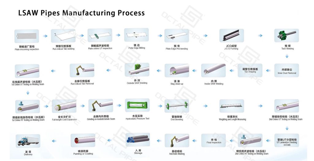 LSAW pipe( Longitudinal Submerged Arc Welded ) is manufactured from steel plate and welded by submerged arc welding along a single straight longitudinal seam, delivering high dimensional precision and reliable seam integrity for demanding service conditions. It is widely used in oil and gas transmission, offshore engineering, and large-scale infrastructure projects where high pressure, temperature variation, and harsh environments require consistent strength and dependable performance.Octal Steel supplies LSAW pipes in diameters ranging from 16 in to 64 in (406 mm to 1626 mm), wall thicknesses up to 75 mm, and grades from API 5L Grade B to X100. With customizable features like 3LPE/FBE coatings, beveled ends, and lengths up to 12.6 m, our pipes are engineered for long-distance pipelines and structural uses, ensuring compliance with global standards and backed by comprehensive testing for worldwide projects. This guide covers LSAW pipe basics, LSAW pipe specifications (OD/WT/tolerance), and key LSAW pipe standards (API 5L / ISO 3183 / GB/T 9711) to help engineers and buyers select the right straight-seam welded pipe for high-pressure projects.