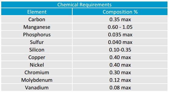 | NOTES: Each reduction of 0.01% for above specified carbon maximum (0.035%), an increase of 0.06% of Mn maximum (1.05%) will permitted up to a maximum of 1.35%. The sum of Cu, Ni, Cr, Mo, and V shall not exceed 1.00%. Cr + Mo shall not exceed 0.32%. |