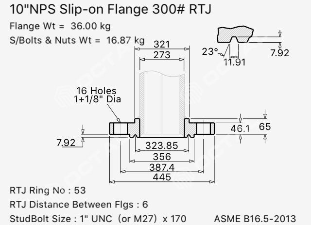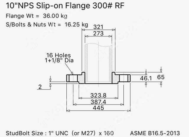 Octal offers slip on flange with materials standards in ASTM A105, ASTM A182, ASME B16.5, BS 3293, DIN 86029.
