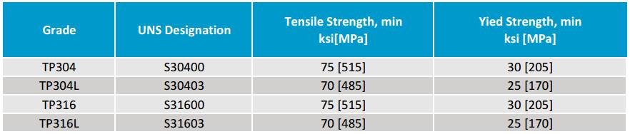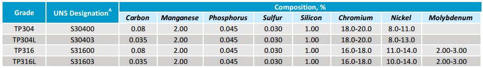 Chemical Composition for ASTM A312 TP304 and TP316