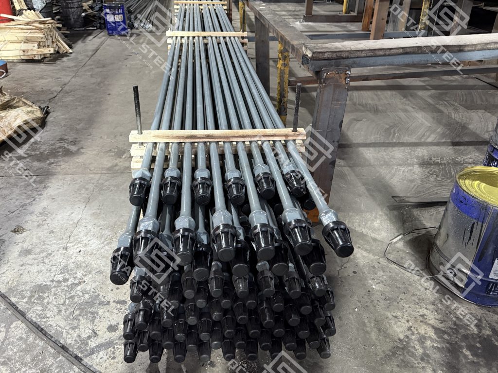 sucker rod is a long, slender rod used in the oil and gas industry, typically 25–30 ft long (5/8″–1-3/4″ OD), primarily in pumping systems for extracting oil from wells. It connects the surface pumping unit to the downhole pump, transferring the mechanical energy needed to lift the oil to the surface. Sucker rods are typically made of steel and are designed to withstand the harsh conditions of the well environment, including high pressures and corrosive fluids.