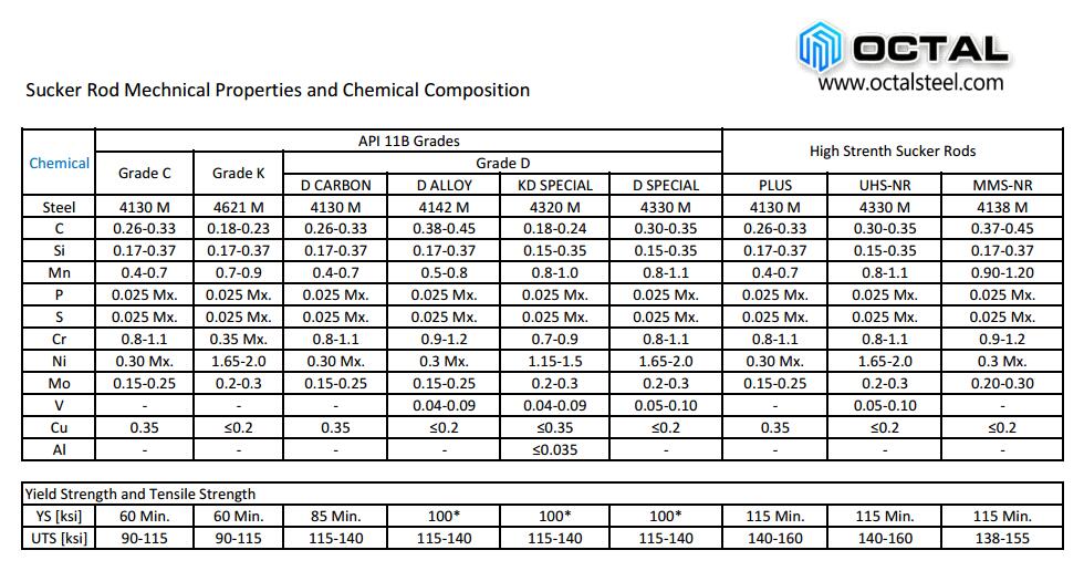 API 11B sucker rod grades in C, K, D, mechanical properties as below: