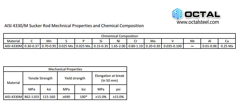 Chemical composition and mechanical properties for general sucker rod 4330/M.