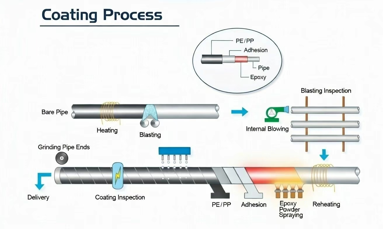 Process window: blast clean (Sa 2½ / NACE No. 2, 50–100 μm), preheat 180–250°C, electrostatic FBE powder coating, fusion bonding cure.
