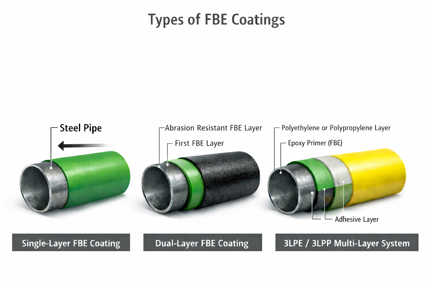 FBE coating is specified in different constructions depending on mechanical damage risk, moisture barrier needs, and system interfaces on coating pipes.