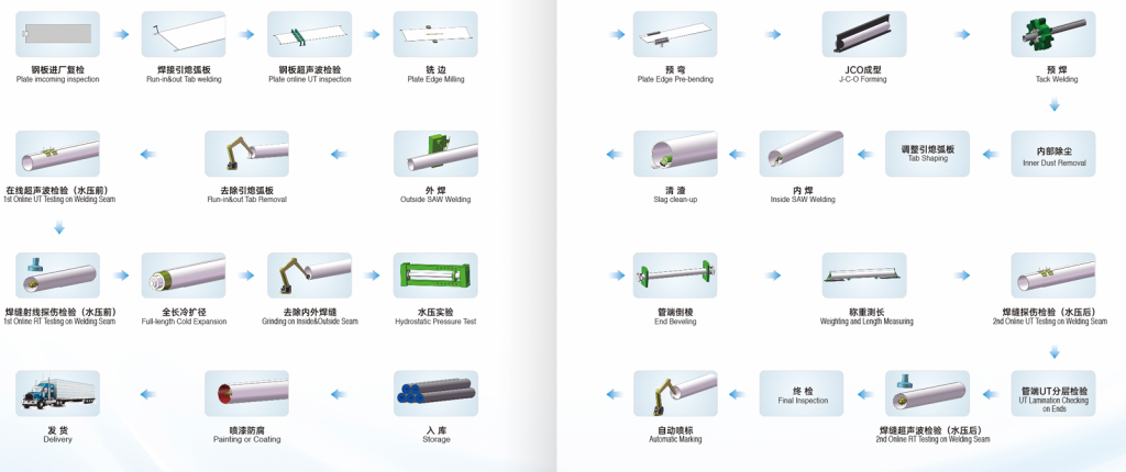 | Welding | Internal & external multi-wire (4+4) SAW stations | Full-penetration welds, qualified to API 5L / ISO 3183 |