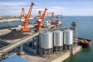 Steel silo Belt conveyor / bucket elevator Air chute Dust control + loading/export |