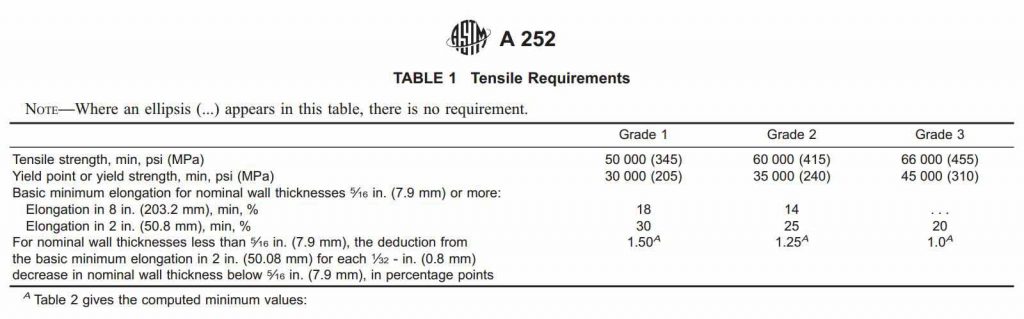 The most widely used standard for pipe pile is ASTM A252. Grades in three levels, Gr 1, Gr 2, and Gr 3.