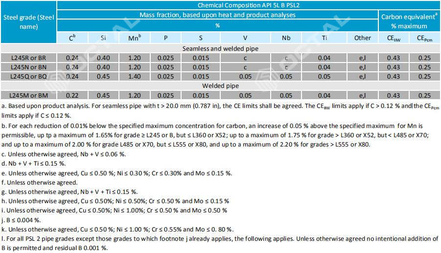 b. For 0.01% reduce of maximum carbon, an increase of 0.05% Mn is permitted, up tp a maximum of 1.65% for grade ≥ L245 or B, but ≤ L360 or X52; up to a maximum of 1.75% for grade > L360 or X52, but < L485 or X70; and up to a maximum of 2.00% for grade L485 or X70.
